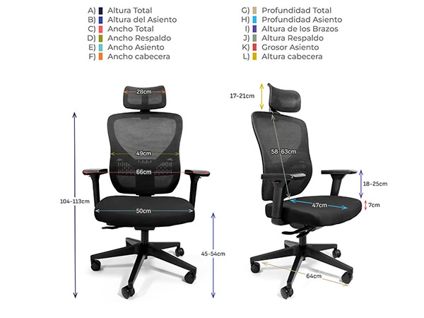- Respaldo: Con ajuste de altura por cremallera, soporte lumbar ajustable en altura