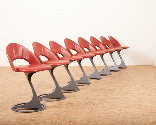 Santiago Calatrava, arquitecto, ingeniero estructural, escultor y pintor, rediseñó el Teatro Tabourettli en Basilea, Suiza, en 1986. Calatrava recibió el encargo de diseñar los asientos para el teatro de cabaret más famoso, como resultado, muestran un juego sobrio pero conservan la elegancia. El marco puede parecer más escultural que práctico, pero los diseños ergonómicos inteligentes en la pata en forma de trípode y el respaldo semicircular los hacen bastante estables y cómodos. Estas sillas permanecen en excelentes condiciones originales, aún cubiertas con cuero rojo oscuro cosido con detalles de cremallera. Estas sillas fueron diseñadas para reflejar la estructura del techo, la escalera y las lámparas, vinculando los muebles con el diseño del edificio.